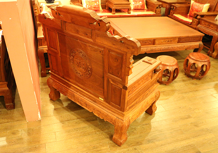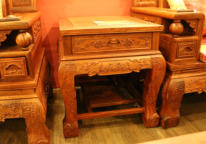 之后,我們?cè)賮砜纯瓷嘲l(fā)的細(xì)節(jié):雕刻紋樣。單人沙發(fā)背板后刻有一大圓形“福”字樣的圖案,有福祿雙全、福星高照之意;在沙發(fā)正上方刻有一帶“發(fā)”字的花紋,寓有大吉大利、財(cái)源亨特之意;沙發(fā)正背板處刻有樹杈、枝葉以及小鳥,頗顯生氣與活力,帶有春意濃濃、朝氣蓬勃之寓意;沙發(fā)靠手兩側(cè)帶有一可以轉(zhuǎn)動(dòng)的滾珠,在其下方則有一可以推入拉出的小屜,多以裝飾之用。我們?cè)賮砜纯磁c之沙發(fā)配套的高幾,高幾上方抽屜拉環(huán)處刻有一十分立體飽滿之元寶圖案,彰顯著財(cái)運(yùn)滾滾系列沙發(fā)的初始寓意,其下方鑲嵌刻有一古時(shí)候人們常佩戴之金鎖圖案花紋,并串有幾圈環(huán)形銅錢,而兩側(cè)則分別帶有兩只金雞圖案的刻紋遙頭相對(duì),昭示著金雞破曉,財(cái)源廣進(jìn)之意,十分形象生動(dòng)。在其幾腿上則配以祥云花紋環(huán)繞相倚,給人一渾渾一體、流暢行云之感。其他兩只,雙人長沙發(fā)以及臺(tái)幾其中花紋也多以其類似相間,鑒于筆者文字水平以及無實(shí)物接觸的原因,有些細(xì)節(jié)之處可能并未在此提及,不過這一系列之沙發(fā)總體以賦含了“財(cái)源滾滾”“財(cái)運(yùn)亨特”“大吉大利”之意,配之以古樸的木雕工藝以及中國文化之豐富內(nèi)涵與底蘊(yùn),給人以一股極為濃郁的東方家具之氣息,美麗沉淀。