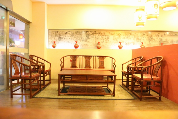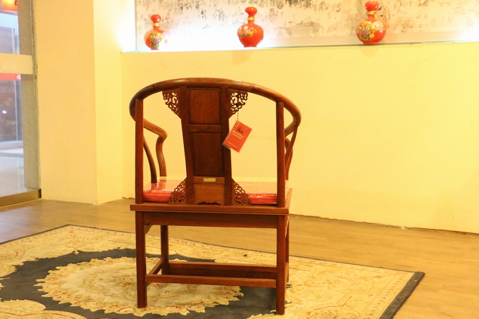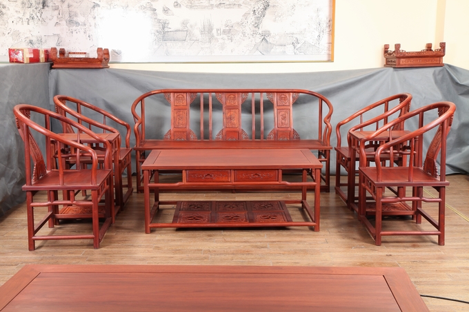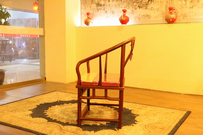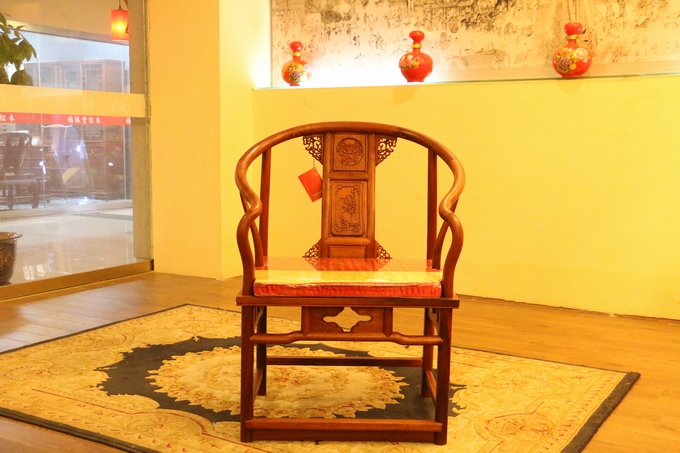 先來看看單人位沙發(fā)——圈椅,此圈椅沿襲了明代遺風(fēng),總體柔婉流暢的線條,顯露出設(shè)計(jì)者巧思之美;而少見的不出頭扶手直接與鵝脖相卯合,給人以纖秀雅巧的感覺;加上優(yōu)質(zhì)的緬甸花梨木作為用材,使較易損壞的椅圈也更顯牢固堅(jiān)硬,兼具了形態(tài)之美與優(yōu)秀的做工的同時(shí),還擁有著良好的用材,優(yōu)美優(yōu)質(zhì)。雕飾圖案上的內(nèi)容包括有:在靠背板處的上方——一輪外圓框鑲嵌而內(nèi)的艷麗的牡丹花紋飾作為點(diǎn)綴,昭顯著”富貴”與”祥和”之瑞氣;中間位置還有——一株插在瓶器中的花草清野以及一矮小型的長青株卉,透露出一股淡淡的青草氣息,花香悠長,自然生氣;另外在其靠背板上下的左右兩側(cè)以及券口牙子部分還雕飾有些許簡單的鏤空紋飾作為處理,給整體營造出一種典雅的中國風(fēng)氣息感受,細(xì)膩而又含蓄。